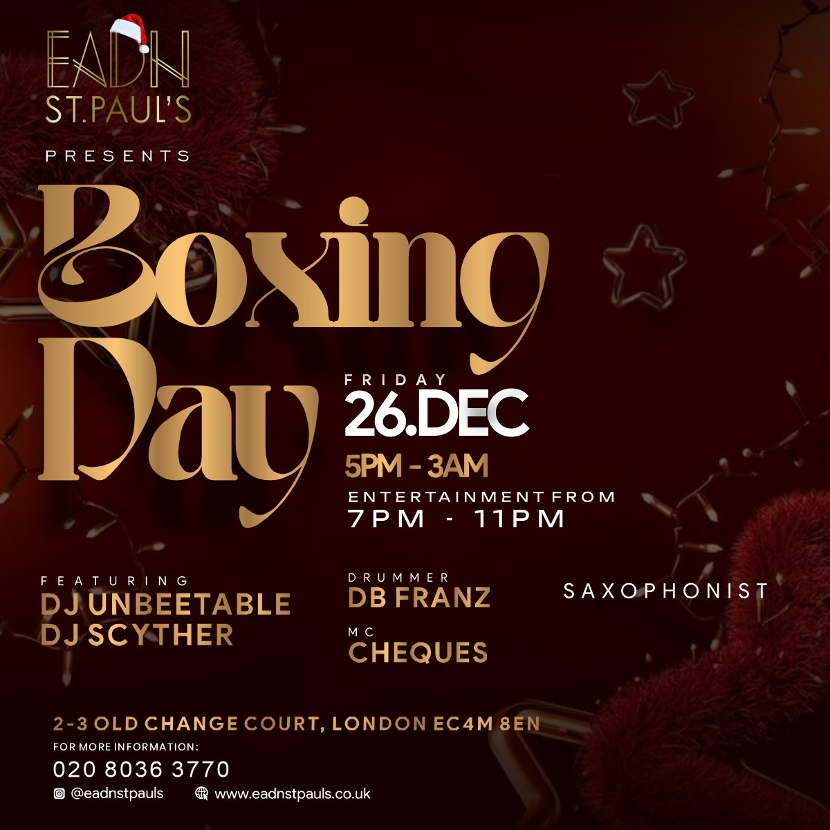 This Boxing Day, immerse yourself in the lively ambiance at Eadn. Shake off Christmas and step back into the vibes. Great food, cocktails and smooth music all day and night.